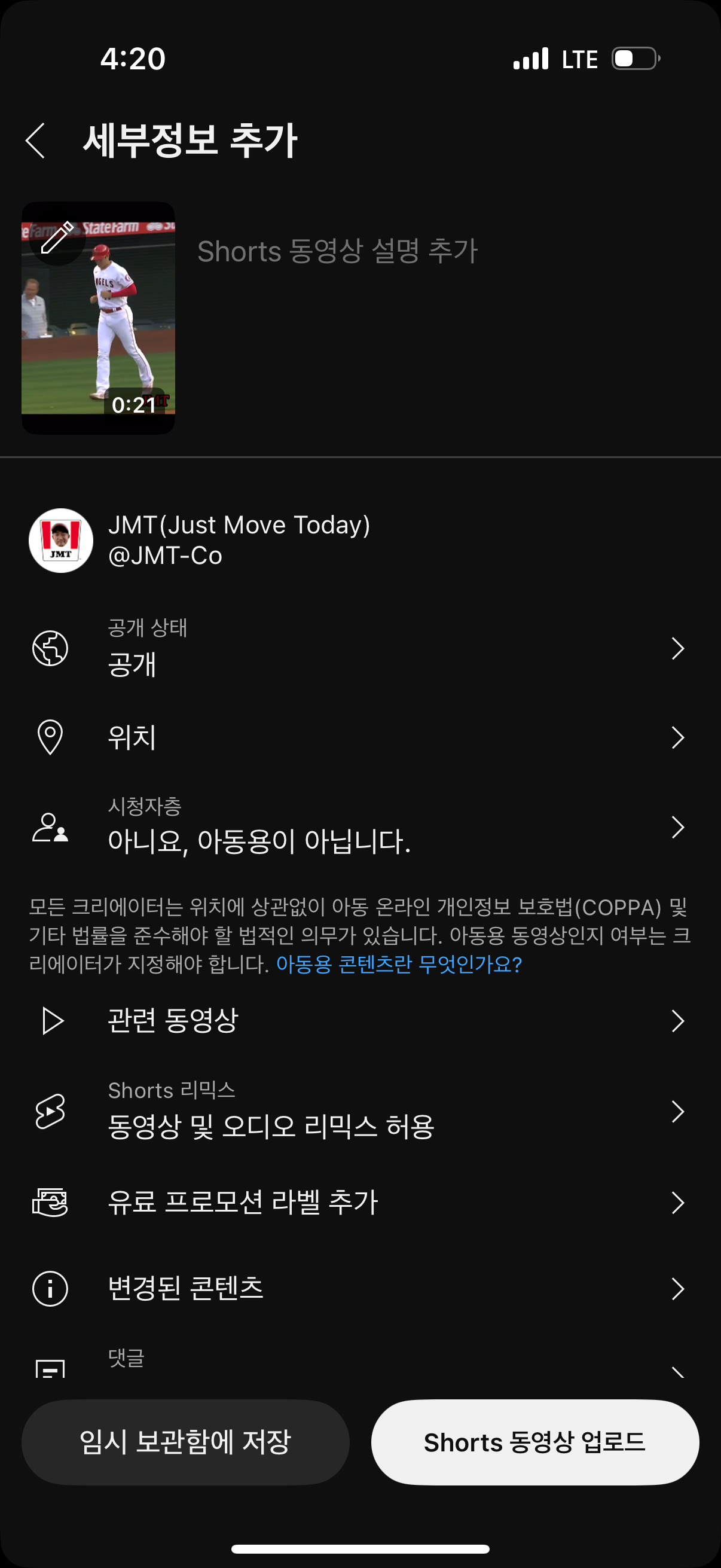 • 자동으로 “쇼츠 전용 업로드”로 처리되기 때문에, 기존 영상처럼 썸네일 파일을 업로드할 수 없고,