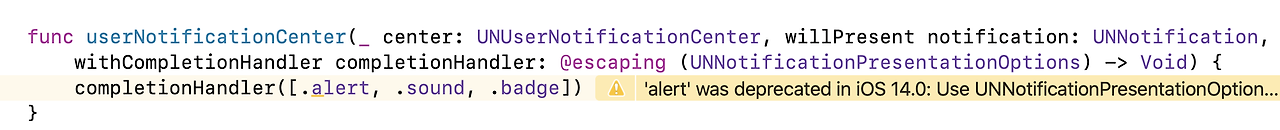 completionHandler에 option들을 넣어줘요. .alert는 iOS 14.0에서 deprecated래요. 하지만 전 iOS 13.0을 쓰니까 ㅎ
