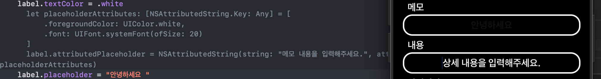 일단 이것도 간단한 기능이 있었는데 나한데는 적용이 안되길레... 이유는 모르지만 많이 헤맷다.아무튼 방법은 알아내서 남긴다. 이처럼 선택하고 글을 적어도 사라지지 않은 안내문구~ 빡친다. 그래서 구글 서핑 엄청나게 했다.... func textFieldDidBeginEditing(_ textView: UITextField) { if textView.text == "메모 내용을 입력해주세요." { textView.text = "" textView.textColor = UIColor.black } if textView.text == "상세 내용을 입력해주세요." { textView.text = ""..