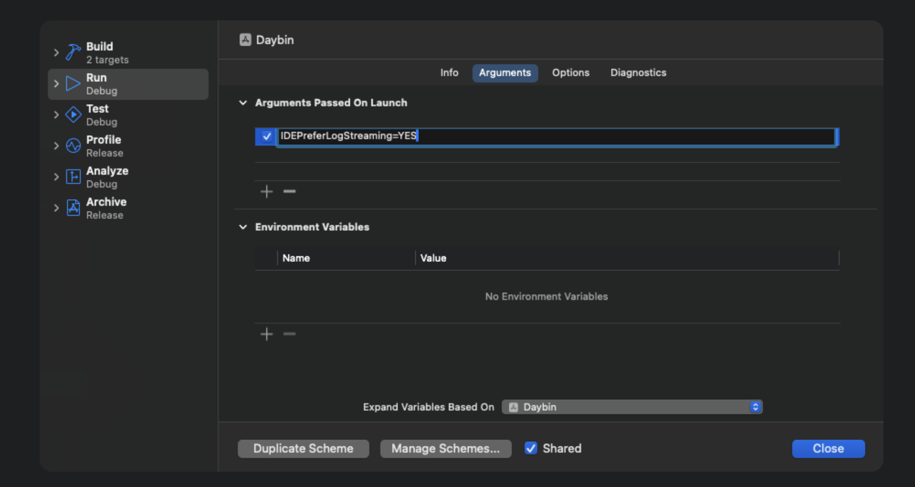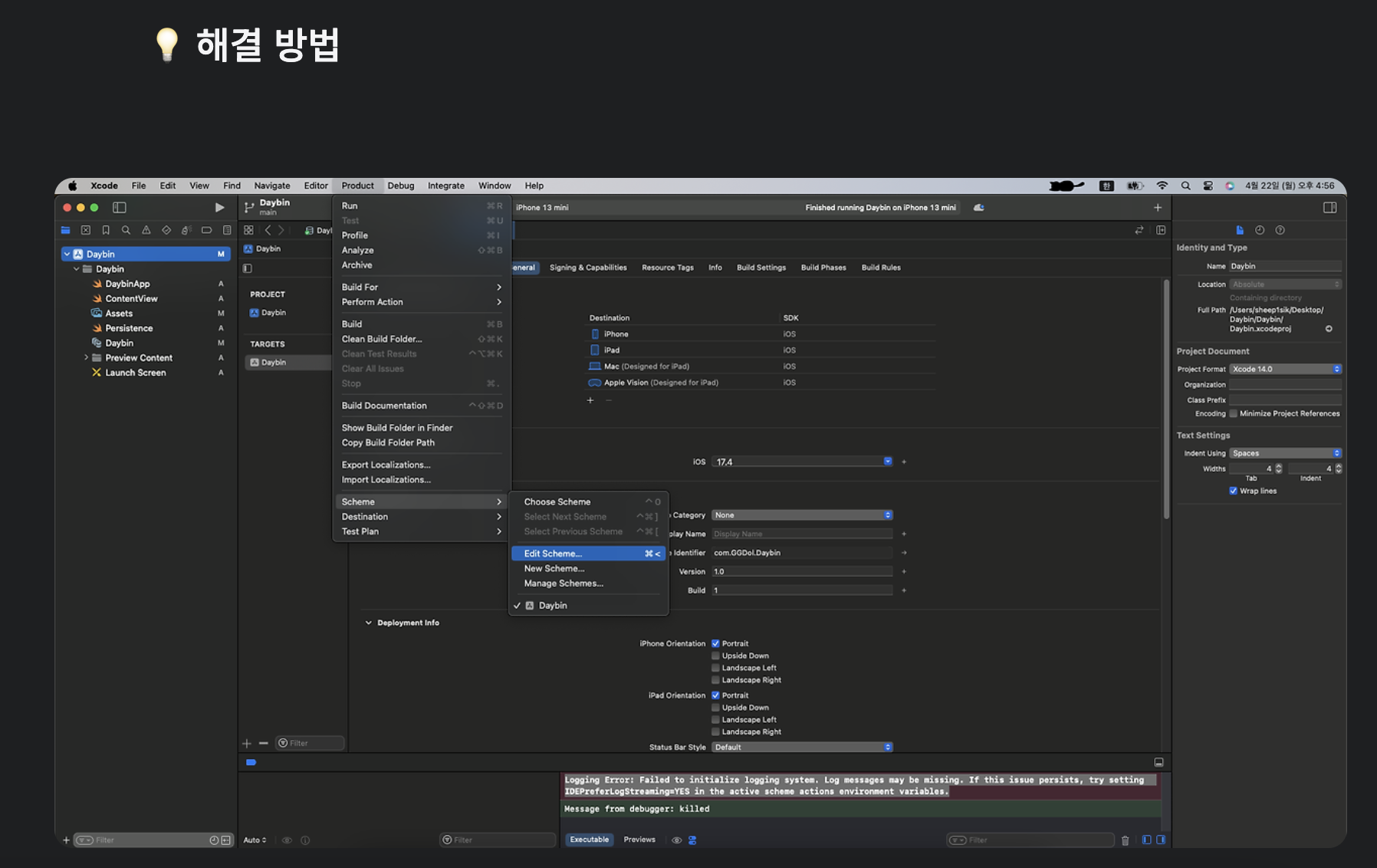 이미지와 같이 + 누른다음에 IDEPreferLogStreaming=YES 입력후 close 누르면 된다 ~