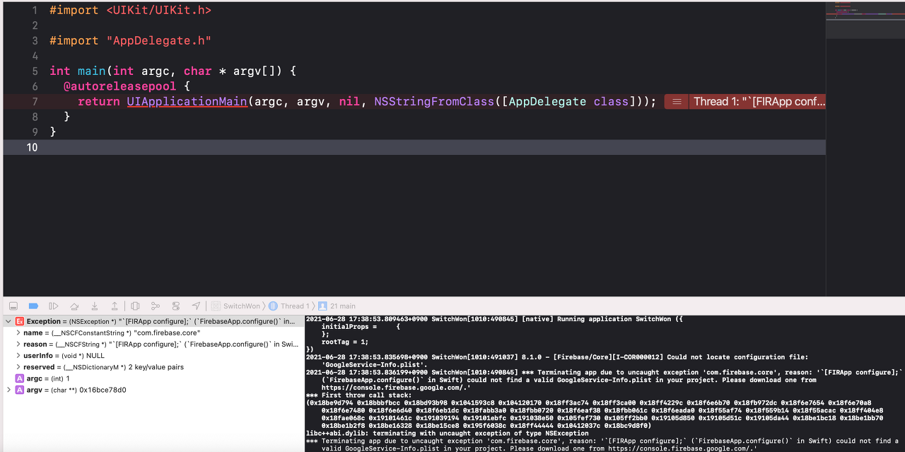 Exception NSException * "`[FIRApp configure];` (`FirebaseApp.configure()` in Swift) could not find a valid GoogleService-Info.plist in your project. Please download one from https://console.firebase.google.com/." 0x00000002826939f0