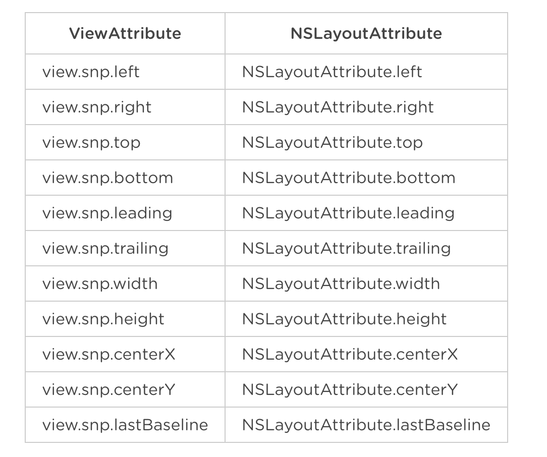 우선 아래 표처럼 스냅킷의 ViewAttribute는 NSLayoutAttribute와 매칭됩니다.