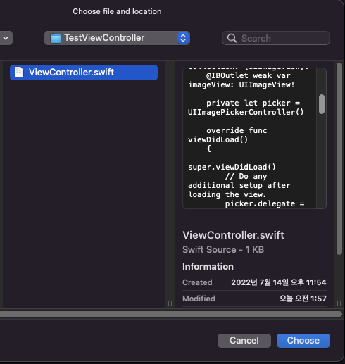 TestViewController 속 ViewControlelr.swift 파일을 클릭 후 Choose를 할게요 !!