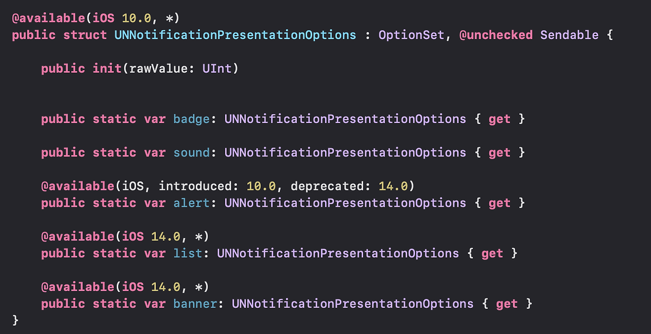 UNNotificationPresentationOptions 중 .alert가 iOS 14부터 deprecated 되었다. 즉 알럿이 두가지 역활에서 세부 적으로 나뉜것