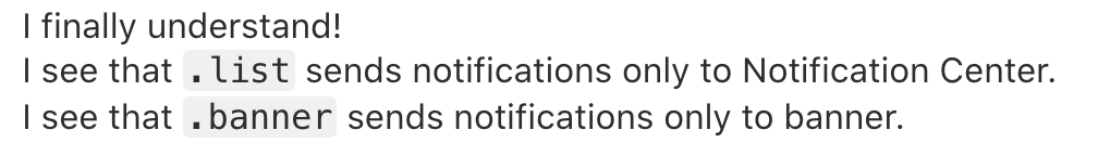 App이 켜져 있든 꺼져 있든, 상단 배너에도 뜨고, Notification Center(잠금 화면)에도 뜨도록 하고 싶다면, UNNotificationPresentationOptions에 .banner와 .list를 둘 다 써주면 된다.