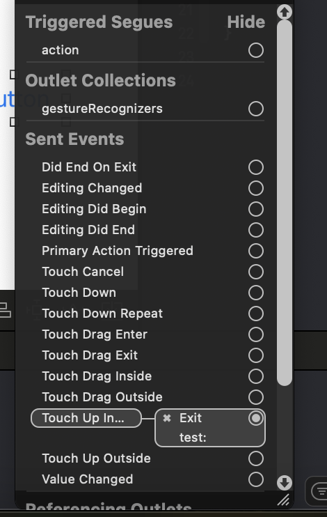 또는 액션으로 해야하는데 아울렛으로 했다면 버튼에서 우측 마우스 클릭하여 이전 기능 연결된 것을 삭제하고 다시 연결시키면 된다.