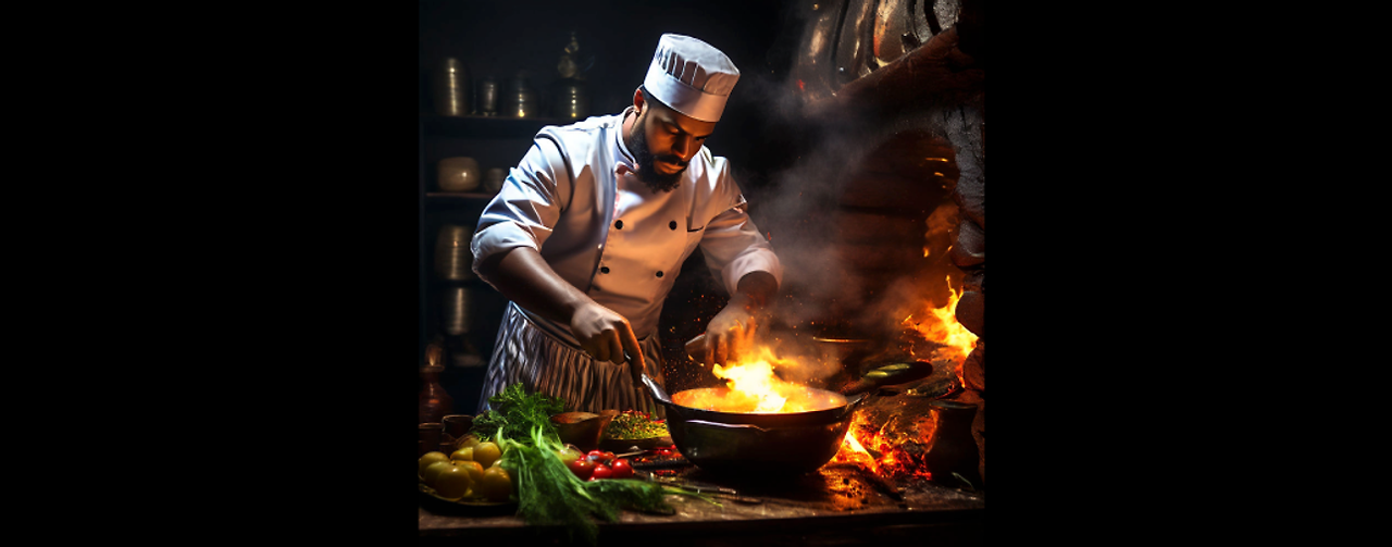 - 조리대에 수많은 식재료들이 있고, 열심히 요리를 하고 있습니다.